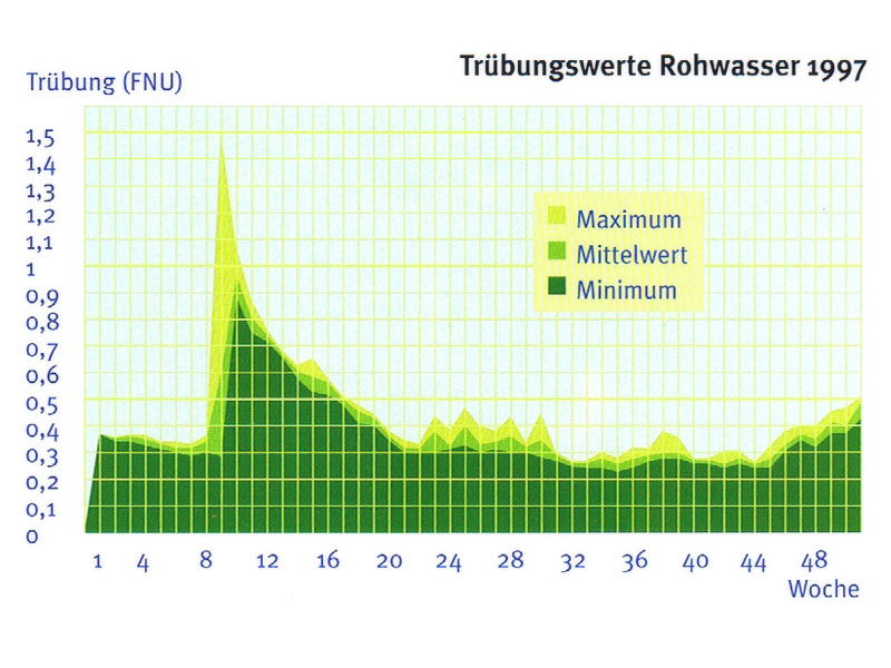 Das Rohwasser wird über einen Entnahmeturm entnommen. Je nach Rohwasserqualität kann das Rohwasser aus 8 verschiedenen Entnahmehorizonten bezogen werden.